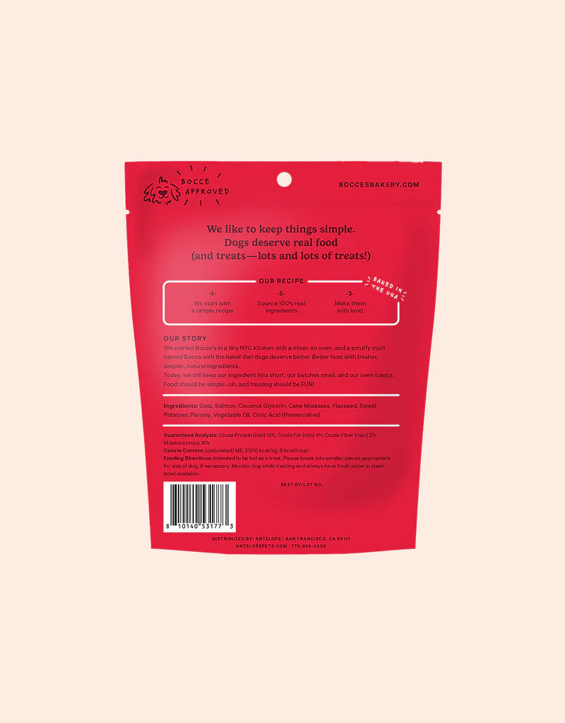 Ingredients: Oats, Salmon, Coconut Glycerin, Cane Molasses, Flaxseed, Sweet Potatoes, Parsley, Vegetable Oil, Citric Acid (Preservative)