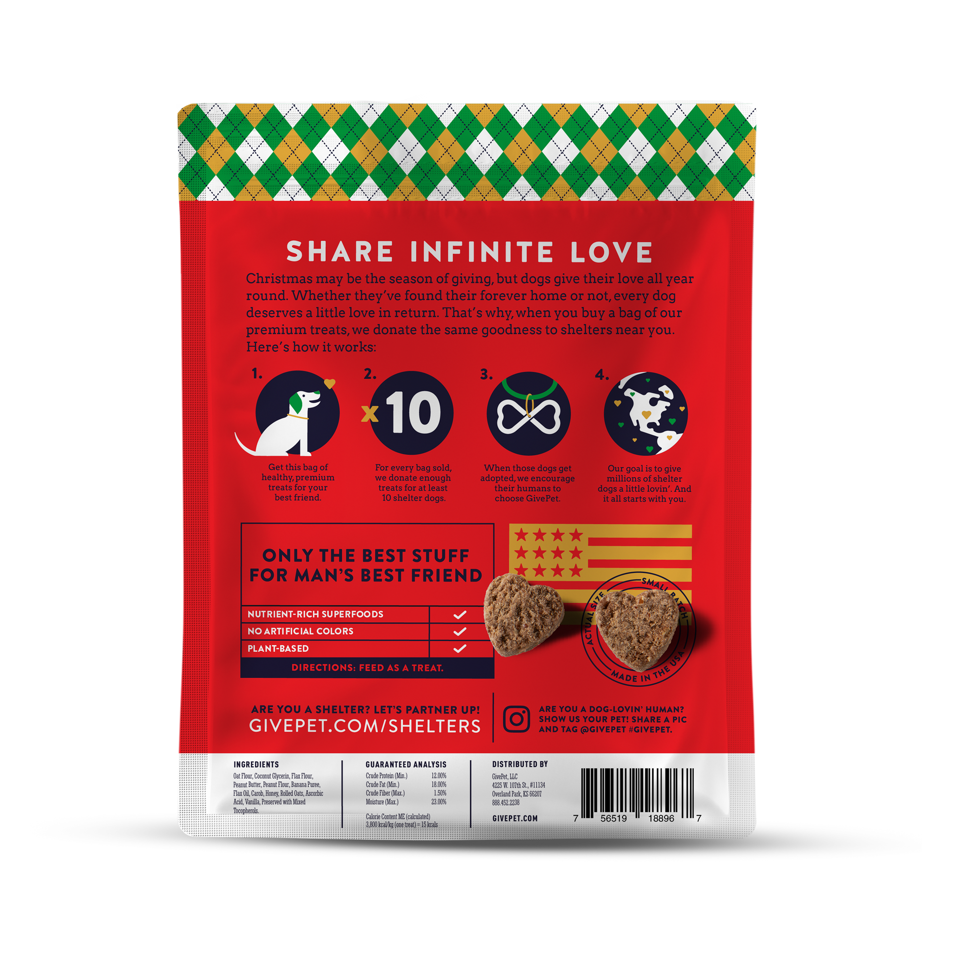 Holiday-themed soft and chewy training treats – Grain-free, made with nutrient-rich whole foods and superfoods. Peanut butter, banana and carob flavor.