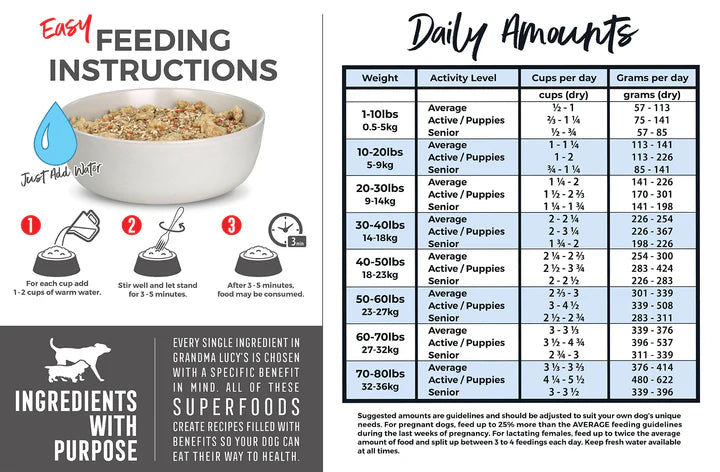 Mmmmmmm. Can you smell that delicious home-cooked meal? Your furry kids can! That warm, soothing feeling you get when you taste a home-cooked meal is something your pet will feel when they taste a Grandma Lucy's Recipe. These artisan meals are made with the highest-quality, whole food ingredients and are prepared in small batches. Ths is a freeze-dried meal, so don't forget to rehydrate!