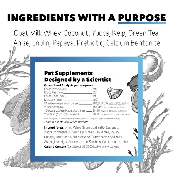 InClover's Dental Supplement for Dogs + Cats is scientifically formulated, and clinically tested to be a beneficial product for your pet’s daily dental care routine. All ingredients are formulated by a biochemist to work together to control bacteria that promote plaque and tartar in the mouth, freshen breath, and polish teeth helping your pet sport his pearly whites! Simply shake it on food at feeding time!