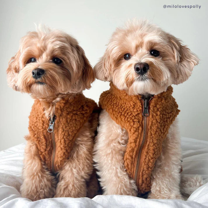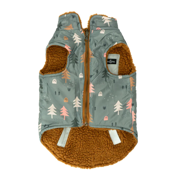 The Take a Hike Reversible Teddy Vest is full of warm cinnamon tones and an evergreen tree print that will have you dreaming of days on the trail! This warm and fuzzy dog jacket is sweeping winter wardrobes and blanketing its wearers in a big bear hug! We had the on-the-go dog in mind when we designed these: zip closures and a leash clasp opening on the back side of the vest make getting out the door easy.