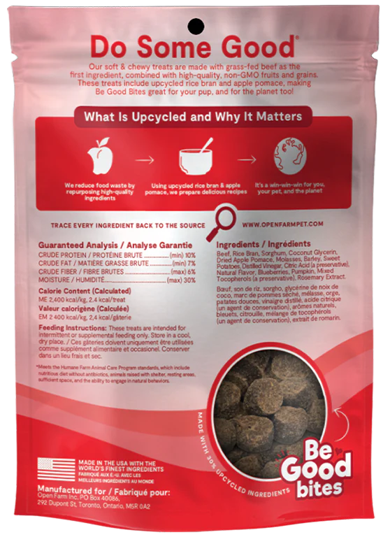 Our Grass-Fed Beef Recipe Soft & Chewy treats are made with humanely raised grass-fed beef as the first ingredient, combined with high-quality non-GMO fruits & grains. These treats included 30% upcycled ingredients, making Be Good Bites great for your pup and the planet too! Approximately 180 Treats per bag