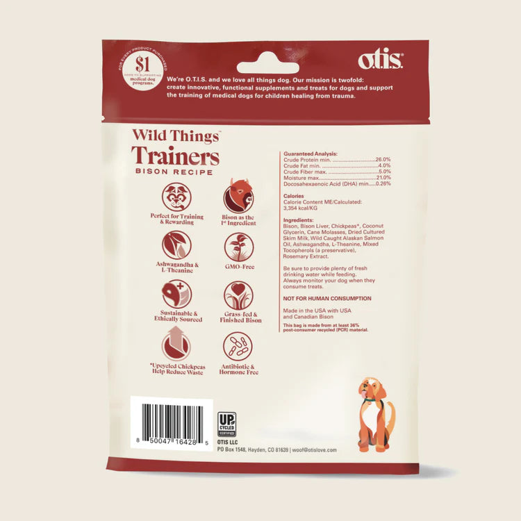 This 4-ounce, resealable bag of Bison dog training treats is a pantry must. O.T.I.S. Wild Things Trainers are bite-sized functional training treats made with ashwagandha, L-Theanine and DHA for cognitive development. Perfect for all dogs of all sizes and ages.