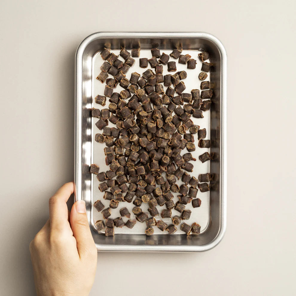 Polkadog dehydrated duck liver dog treats. Handmade daily in Polkadog's Fish Pier kitchen with locally sourced U.S. duck liver and natural potato flour, nothing says decadence quite like these crunchy, grain-free nuggets. Perfectly show-sized-for-training on the go, these precious gems are a veritable bowl of unicorns and rainbows.