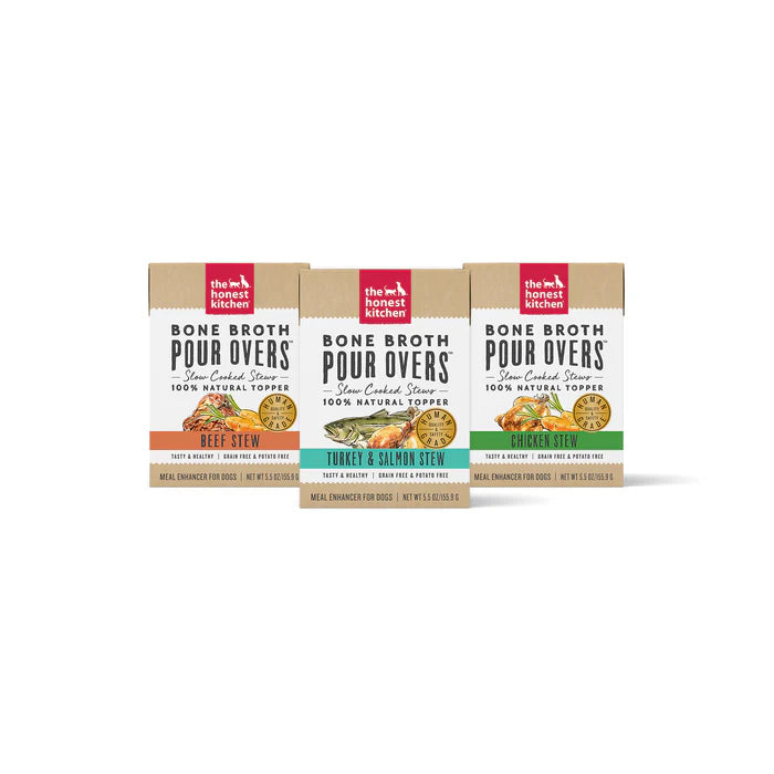 Bone Broth Pour Overs: These human grade, tasty pourable stews are full of meaty goodness in a bone broth reduction and boosts their bowl with an extra helping of protein.