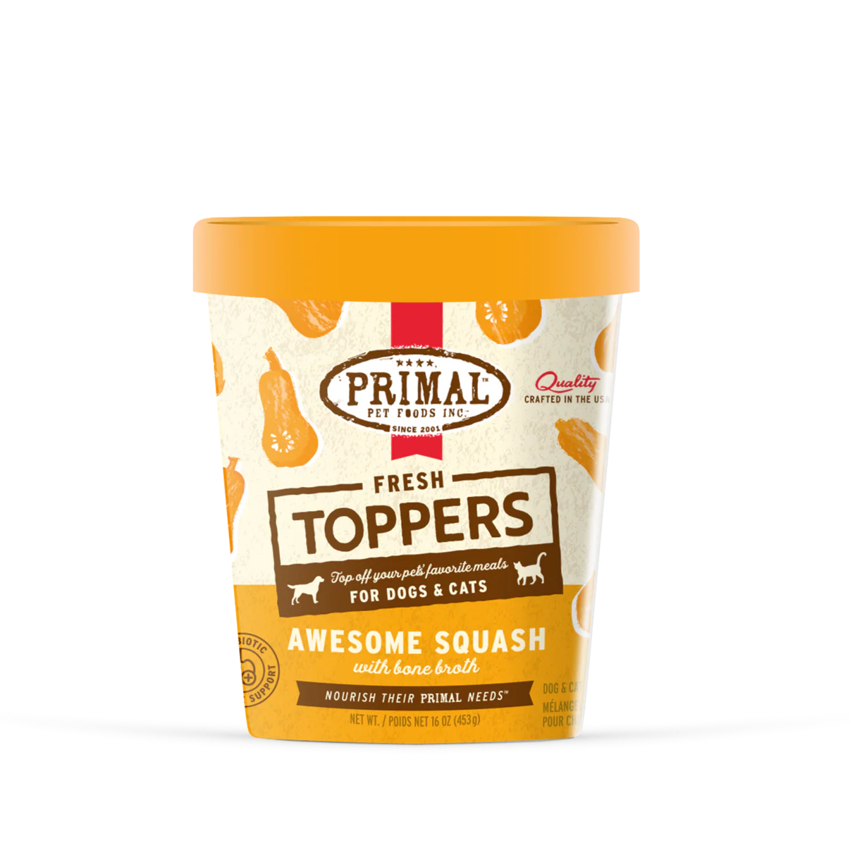 Primal’s Awesome Squash Fresh Topper for cat and dog food is formulated to support your pet’s digestion with gut-nourishing butternut squash, probiotic-packed apple cider vinegar, and organic cinnamon, turmeric, and ginger. Just thaw in the refrigerator overnight and scoop onto canned, kibble, or freeze-dried food for an easy way to add raw, whole-food nutrition to your dog’s or cat’s diet.