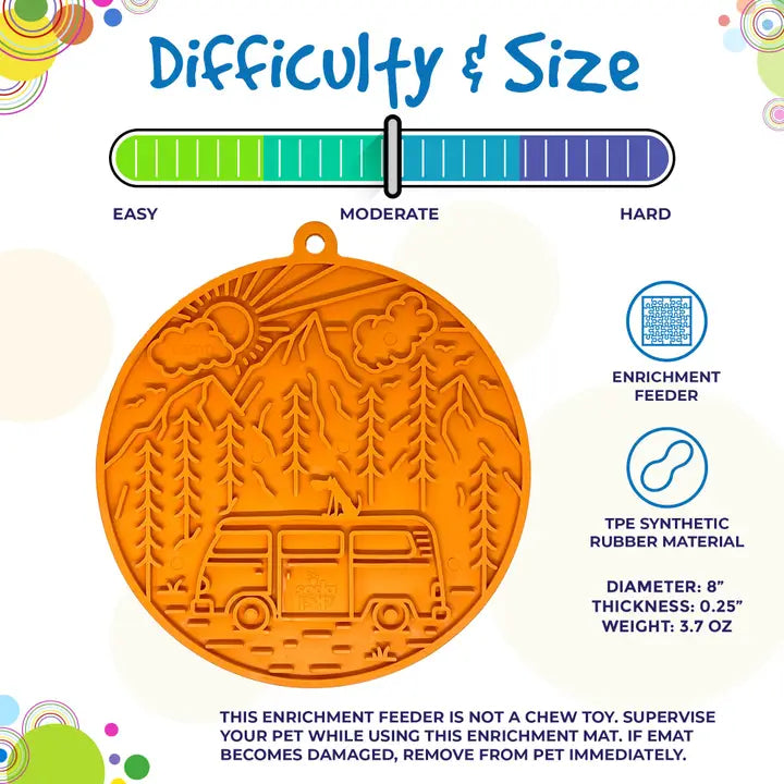 Add some fun to your next road trip or van life adventure with our Camp eMat Enrichment Lick Mat. Designed for the great outdoors, this orange mat features suction cups on the back for easy use in your caravan. Keep your furry friend entertained with this quirky and playful enrichment mat!