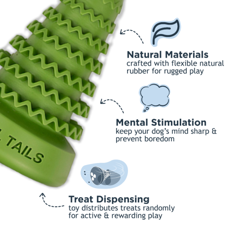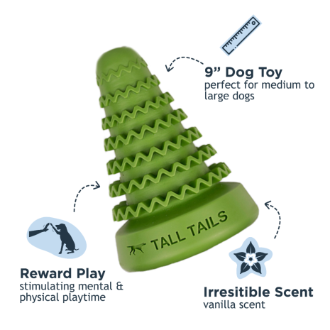 The Evergreen Dog Toy from Tall Tails is crafted from durable and flexible natural rubber, providing a stimulating mental and physical playtime. Your pup can toss this toy around to dispense treats during reward play or lick their favorite spreadable from the outer grooves. The irresistible vanilla scent and the mental stimulation from this toy will be your dogs favorite! The easy cleaning and challenges that keep your dog happy will be your favorite!
