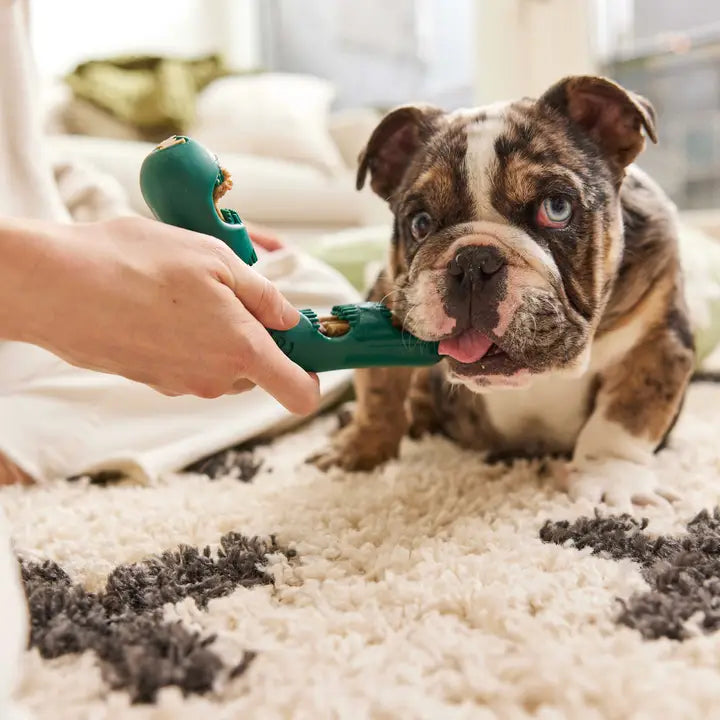 You brush your teeth, now your dog can brush theirs! The Bite n’ Brush is designed to extend the time it takes to chew a dental treat, so you can get some peace and quiet and the active ingredients can get to work. The V-shaped design of the Bite n’ Brush lets dogs brush their own teeth with special bristles sized just right to scrub plaque and tartar from all sides of the teeth and mouth.