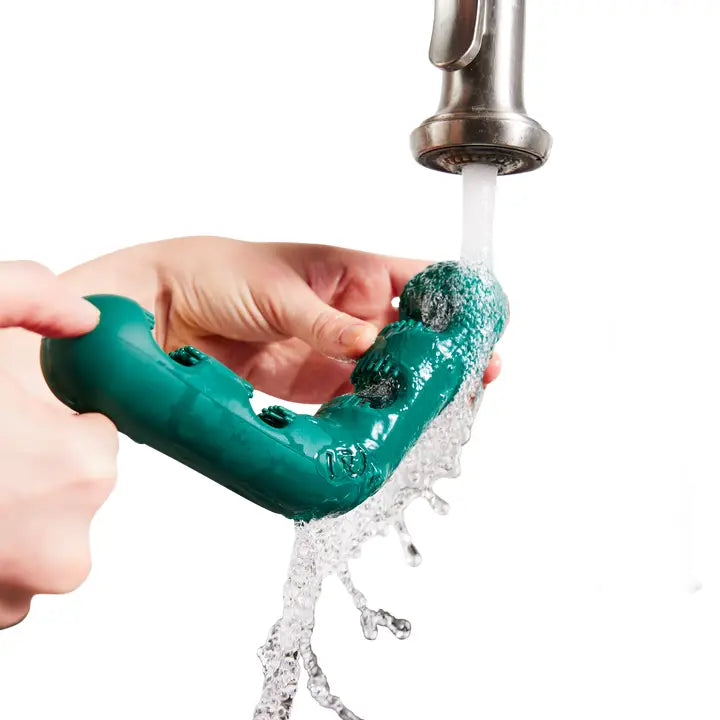 The Bite n’ Brush is made of a non-toxic, BPA- and phthalate-free natural rubber, and comes in two sizes: Small (best for dogs under 25lbs) and Large (best for dogs over 25lbs).