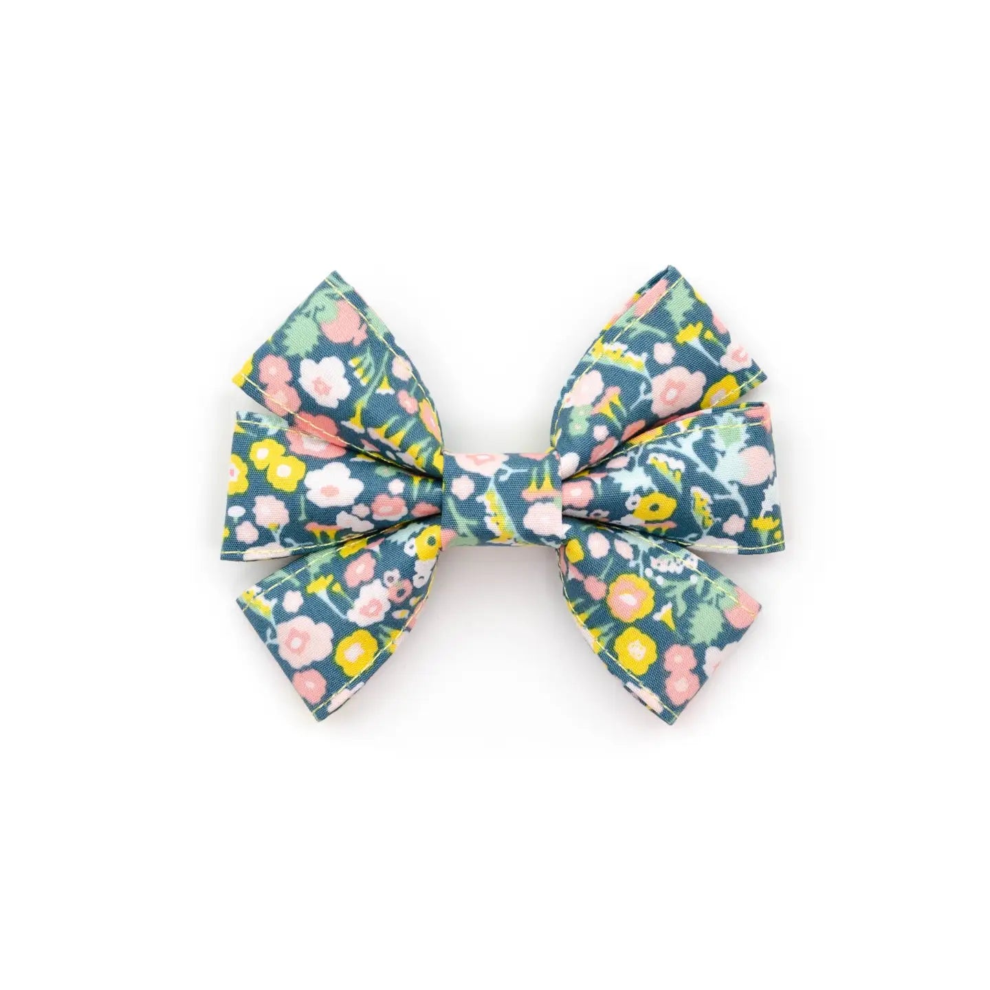 Go full spring pastel with this vintage floral collar bow. Soft pinks, yellows, and peach speckle across a teal-touched green and bring smiles to every precious girl. Only the cutest outfits for ladies Easter brunch!
