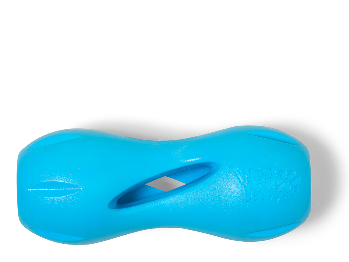 Qwizl is a super tough treat toy that's brilliantly designed to extend the life of expensive dog treats while keeping dogs busy. Side openings release scent and taste while the continuous interior hole allows treats to extend out. Flexible ridges grip multiple sizes of treats.